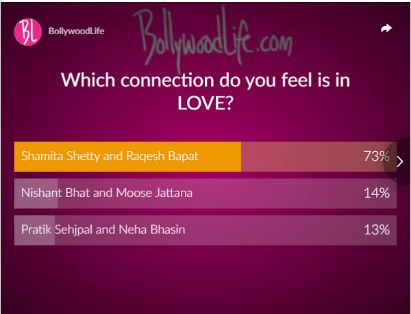 However, amongst them, fans feel that Shamita and Raqesh are in love. 73% of people have voted for Raqesh and Shamita while 14% have voted for Nishant and Moose. The rest 13% have voted for Pratik and Neha.