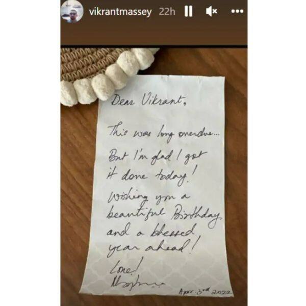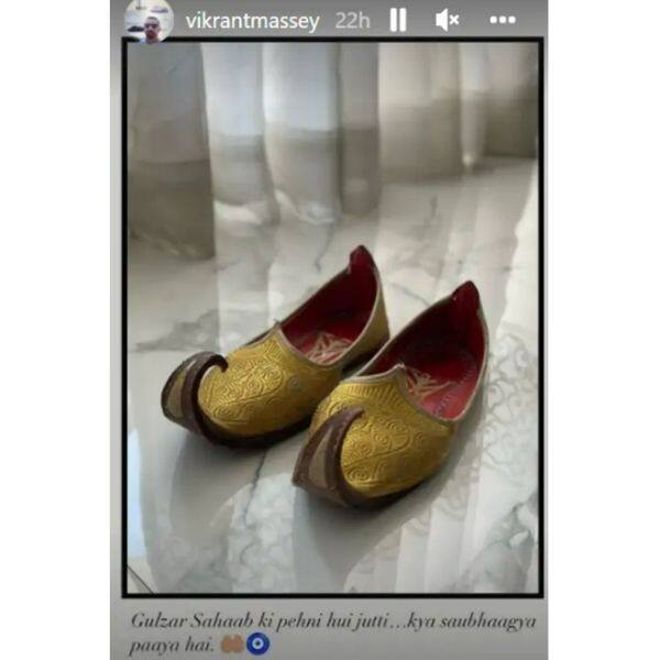 मेघना गुलजार ने विक्रांत मैसी को उनके जन्मदिन पर अपने पापा गुलजार साहब की जूतियां तोहफे में दी हैं। विक्रांत मैसी ने अपने इंस्टाग्राम अकाउंट पर इन जूतियों की तस्वीर शेयर की। इसके साथ ही उन्होंने कैप्शन लिखा, 'गुलजार साहब की पहनी हुई जूती... क्या सौभाग्य पाया है।' इसके साथ ही विक्रांत मैसी ने मेघना गुलजार का दिया हुआ खत शेयर किया। इस खत पर लिखा है, 'प्यारे विक्रांत, ये बहुत दिनों से कर्ज था। लेकिन मैं खुश हूं कि अब मैंने ये कर दिया है। तुम्हें एक खूबसूरत जन्मदिन मुबारक हो और तुम्हारा कल सुनहरा हो।'