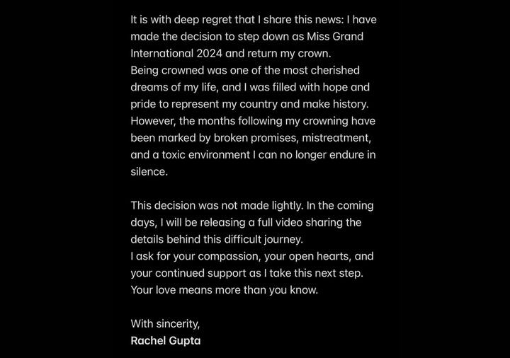Rachel Gupta Controversy: जालंधर की रेचल गुप्ता (Rachel Gupta) ने मिस ग्रैंड इंटरनेशनल 2024 (Miss Grand International 2024) का खिताब जीतकर इतिहास रच दिया था, लेकिन अब करीब एक साल बाद इस खिताब को लेकर विवाद खड़ा हो गया है. हाल ही में रेचल ने एक पोस्ट शेयर कर सनसनी फैला दी, जिसमें उन्होंने बताया कि वह अपना मिस ग्रैंड इंटरनेशनल का खिताब वापस कर रही हैं, तो वहीं दूसरी तरफ ऑर्गनाइजेशन ने उन्हें नियमों के उल्लंघन पर पद से हटाने का दावा किया है. ऐसे में अब सवाल ये उठ रहा है कि क्या रेचल से ताज छीना गया या उन्होंने खुद इसे वापस किया. आइए जानते हैं विवाद का पूरा मामला क्या है?