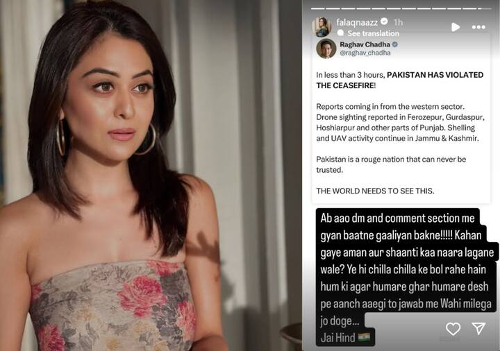Falaq Naazz Reaction To Raghav Chadha Tweet On Pakistan Ceasefire Violation: भारत-पाकिस्तान के बीच सीमा पर बढ़ते तनाव के बीच 10 मई 2025 की शाम दोनों देशों के बीच सीजफायर लागू किया गया था, लेकिन 'संघर्ष विराम' के कुछ ही घंटों के बाद पाकिस्तान ने अपनी नापाक हरकत को अंजाम देते हुए सीजफायर का उल्लंघन कर दिया, जिससे एक बार फिर स्थिति बिगड़ गई. इसे लेकर आम आदमी पार्टी के राज्यसभा सदस्य राघव चड्ढा ने पाकिस्तान को 'दुष्ट राष्ट्र' करार दिया. जिसके बाद उनके इस ट्वीट को टीवी एक्ट्रेस फलक नाज शेयर करते हुए पाकिस्तान के खिलाफ अपनी आवाज उठाई. आइए जानते है फलक नाज ने क्या कहा?