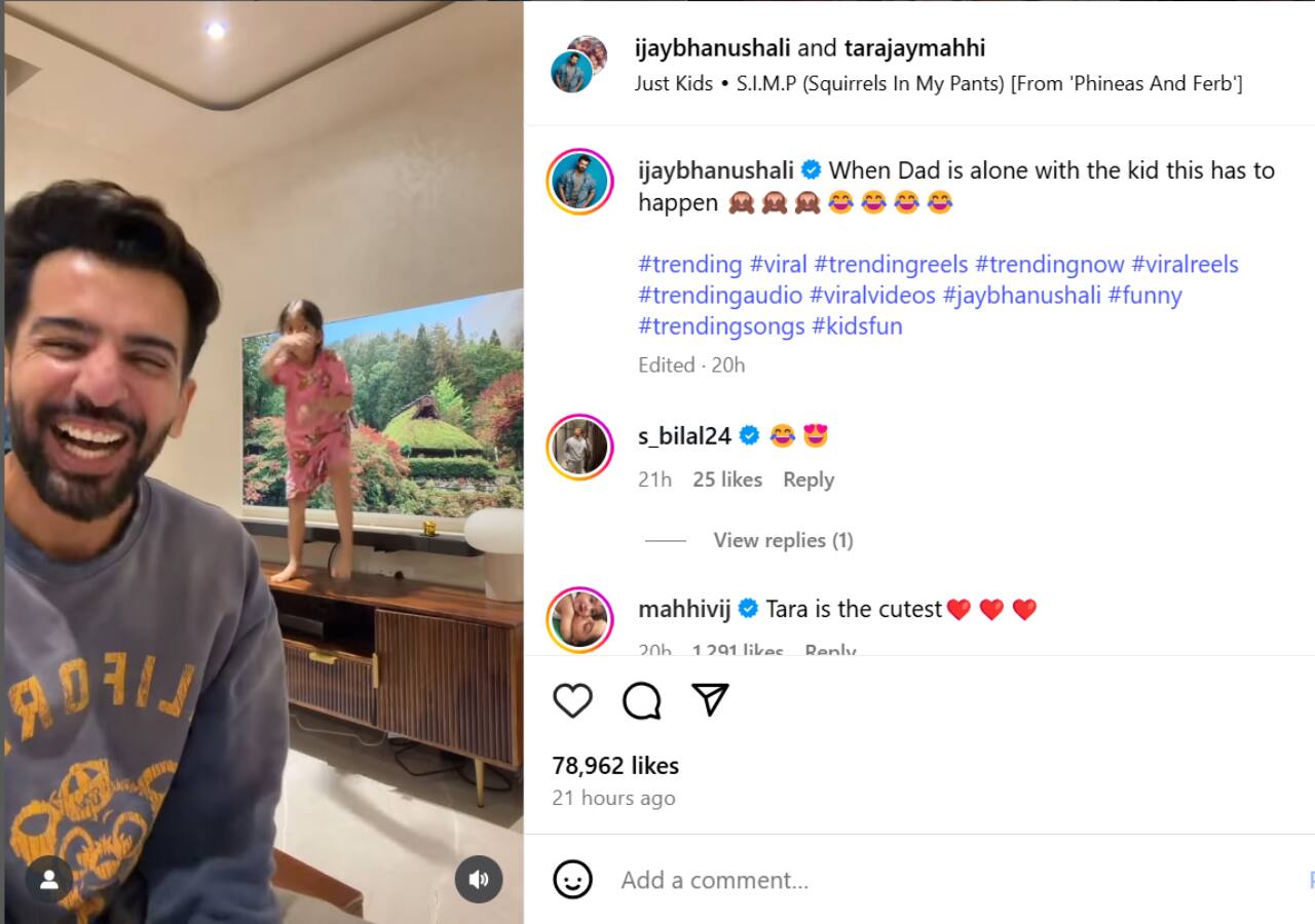 जय भानुशाली (Jay Bhanushali) ने अपने तलाक की खबरों के बीच एक फनी वीडियो शेयर किया है. इस वीडियो में वह अपनी क्यूट बेटी के साथ क्वालिटी टाइम बिता रहे हैं. इस वीडियो में जय और तारा दोनों ही घर में हैं और मस्ती कर रहे हैं. इस वीडियो में तारा एक अलमारी पर चढ़कर डांस कर रही हैं और जय कैमरे की ओर देखकर अपना मजेदार रिएक्शन दे रहे हैं. इस वीडियो के कैप्शन में जय ने लिखा है, 'जब पापा बच्चे के साथ अकेले हो तो ऐसा होना स्वाभाविक है.' इस वीडियो पर माही विज (Mahhi Vij) ने कमेंट किया है, जिस पर फैंस की निगाहें पड़ गई हैं. इस पोस्ट पर माही विज ने कमेंट में लिखा, 'तारा सबसे क्यूट है.' सोशल मीडिया पर जय का पोस्ट और माही विज का कमेंट फैंस के बीच वायरल हो रहा है. इस पोस्ट को देखकर फैंस मान रहे हैं कि शायद दोनों के बीच सब कुछ ठीक है, लेकिन कई फैंस सिर्फ तारा के लिए कमेंट देखकर थोड़ा कन्फ्यूज हो गए हैं.