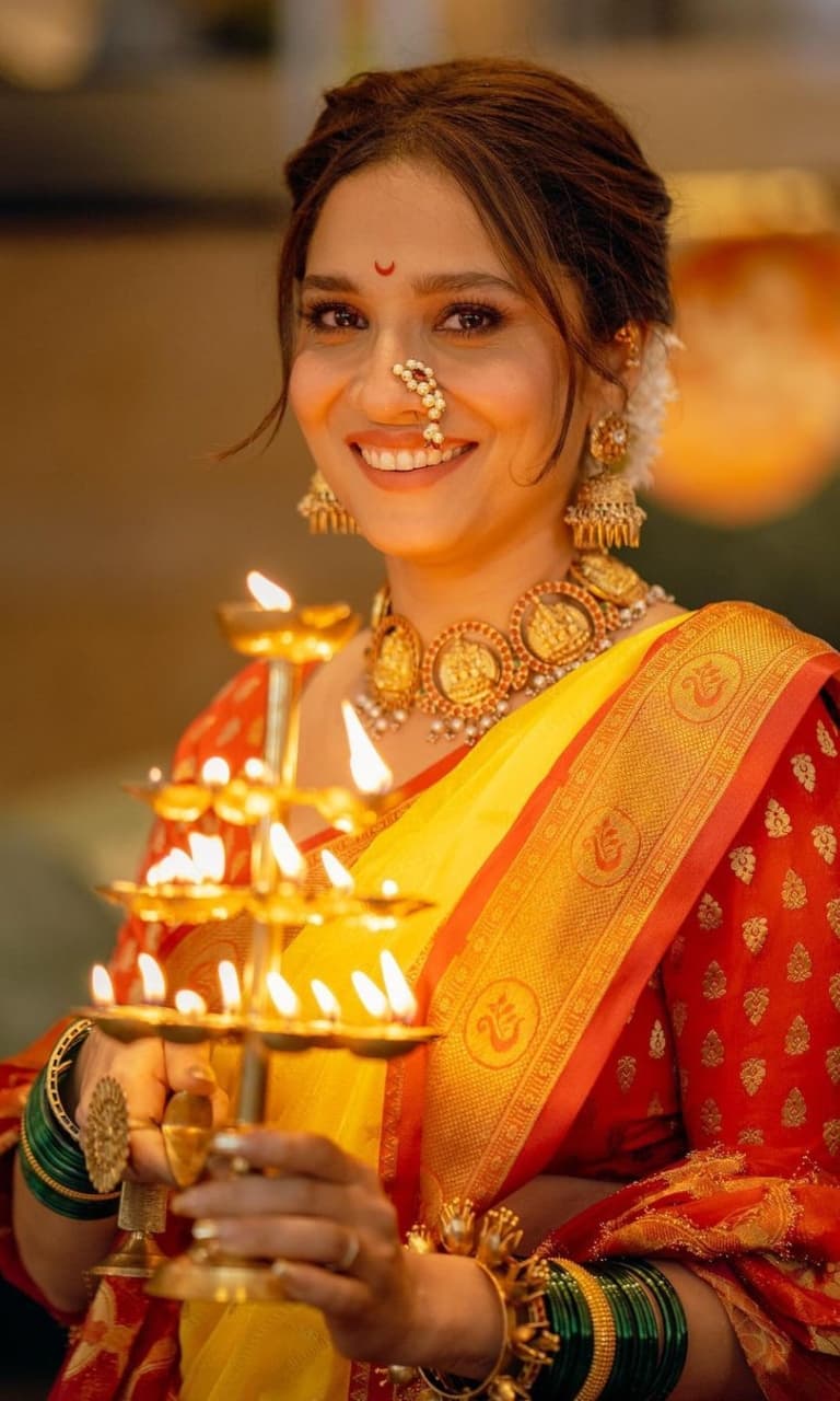 दिवाली के दिन पूजा के लिए अंकिता लोखंडे की तरह यैलो एंड रेड कलर की साड़ी एवरग्रीन च्वॉइस है।