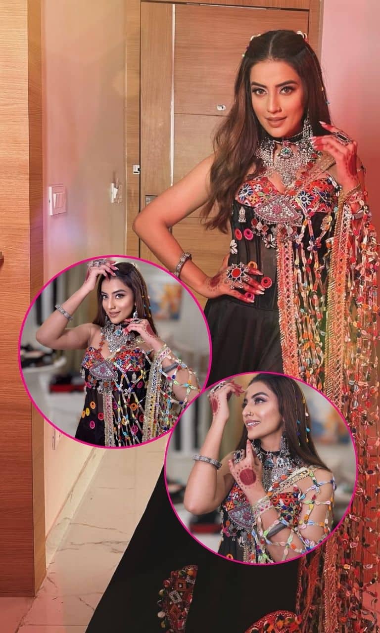 उनके आउटफिट पर रंग-बिरंगे मिरर वर्क और कढ़ाई ने इसे फेस्टिव नाइट के लिए और भी अट्रैक्टिव बना दिया है.