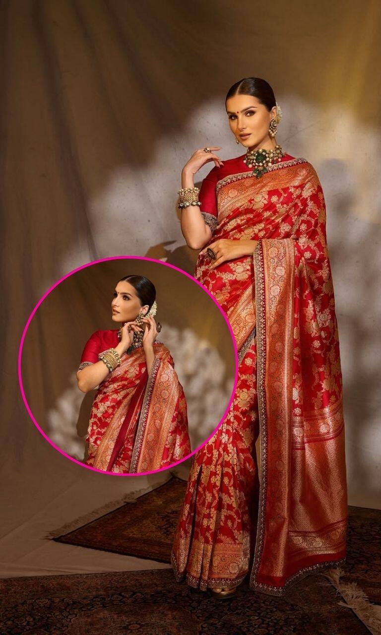 तारा सुतारिया ने अपनी हालिया तस्वीरों में लाल बनारसी साड़ी पहनकर रॉयल लुक पेश किया है.