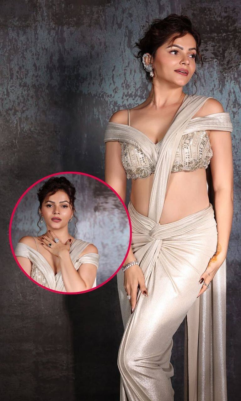 सिल्वर टोन में मॉडर्न ड्रेप साड़ी पहनकर रुबीना बेहद ग्लैमरस नजर आ रही हैं.
