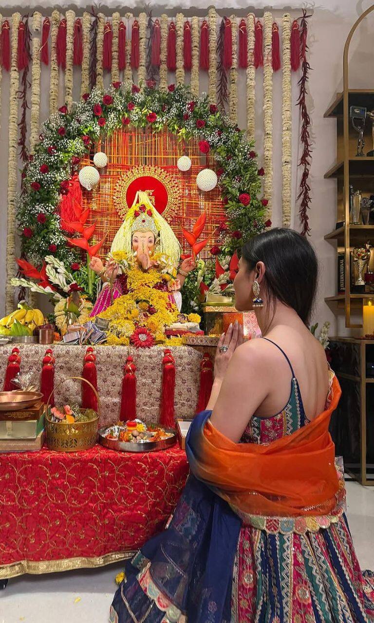 तस्वीरों में मौनी रॉय भगवान गणेश की मूर्ति के सामने पूजा अर्चना करती और मुस्कुराती नजर आईं.