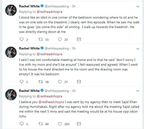 Only a while ago we told you that actress Saloni Chopra and journalist Karishma Upadhyay have accused Sajid Khan of allegedly harassing them. Now Ungli actress Rachel White has also come out to narrate her story involving Sajid Khan. She commented on Saloni's tweet and said, "I believe you @redheadchopra I was sent by my agency then to meet Sajid Khan during Humshakals. Right after my agency told me about the meeting Sajid called me within the next 5 mins and said the meeting would be at his house opp iskon Juhu."