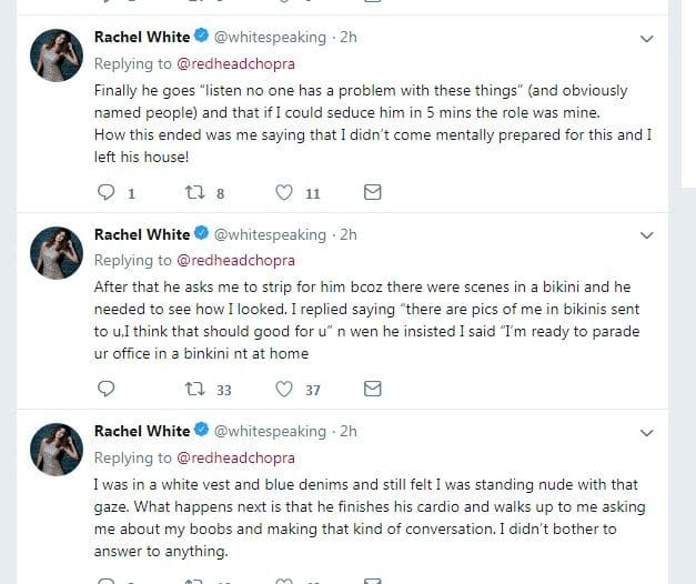 White further narrated, "I was in a white vest and blue denims and still felt I was standing nude with that gaze. What happens next is that he finishes his cardio and walks up to me asking me about my boobs and making that kind of conversation. I didn’t bother to answer to anything. After that he asks me to strip for him bcoz there were scenes in a bikini and he needed to see how I looked. I replied saying “there are pics of me in bikinis sent to u,I think that should good for u” n wen he insisted I said “I’m ready to parade ur office in a binkini nt at home." She also mentioned how he told him people are fine with it which meant she shouldn't resist it either. Check out tweets here...