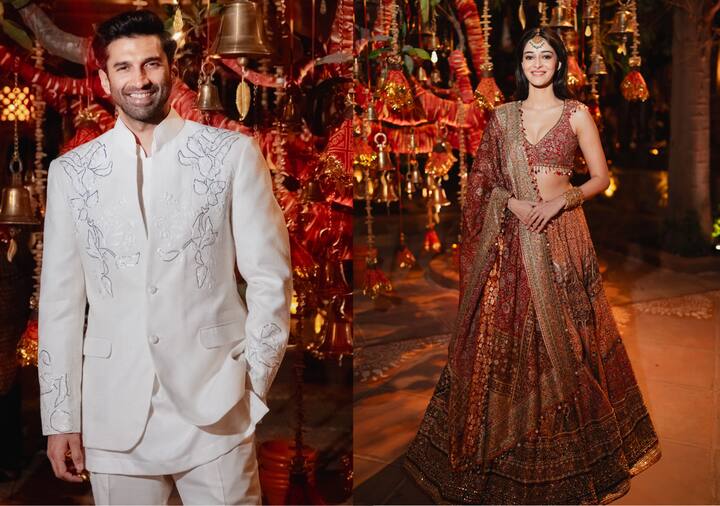 Ananya Panday opted for a heavy lehenga choli look while Aditya Roy Kapur complemented her in a white designer blazer look.