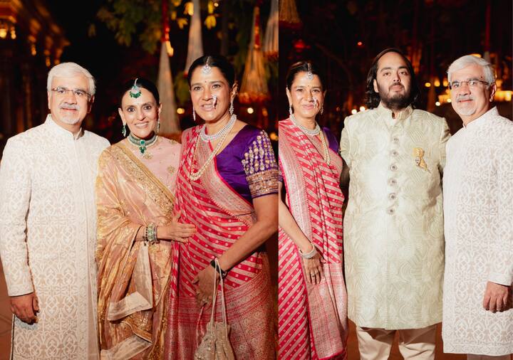 Viren Merchant and Shaila Merchant pose with Anant Ambani and Shloka Mehta's mom. They look so regal no?