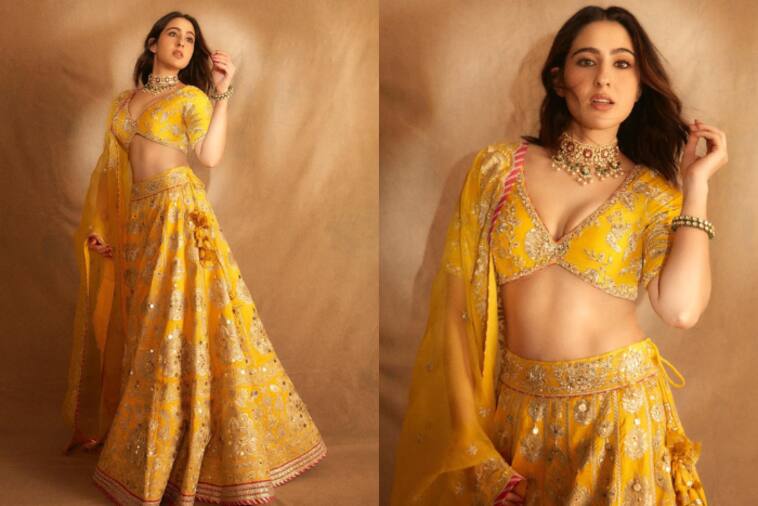 Sara Ali Khan usually rocks pastels and light colours, but here, she has blessed our eyes with this mustard yellow brocade lehenga, filled with gota and sequins. The lehenga is paired with a V-neck choli and was designed by Gopi Vaid. Sara chose to pair this look with a heavy choker round her neck, an organza dupatta, and some statement bangles.