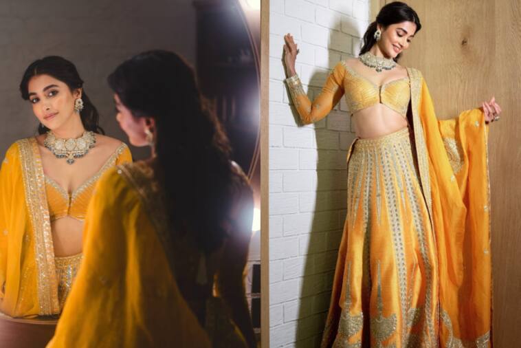 This gorgeous yellow lehenga was worn by the actress on the day of the wedding of Anant Ambani and Radhika Merchant. The actress looked absolutely breathtaking in the lehenga with dori and sitaara work, which was put together by the celebrity designer Masaba’s House of Masaba. She wore a full-sleeved blouse with a captivating deep neckline and completed the look by tying her hair up.