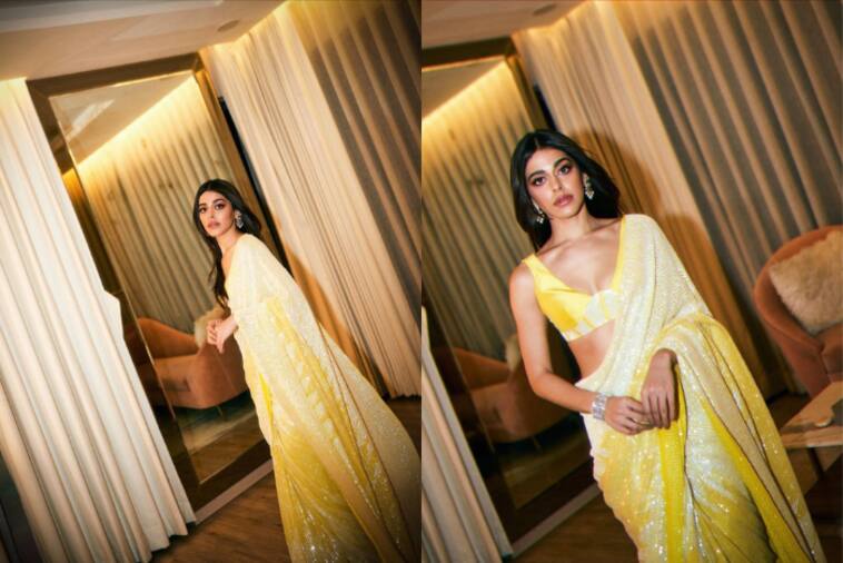 Outfit ideas for any Indian festival cannot be complete without adding a saree to the list. Here. Alaya F looks absolutely gorgeous in this white and yellow sequin saree, designed by Manish Malhotra.