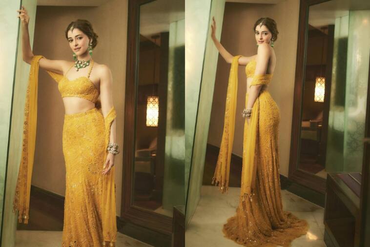 For anyone who loves self-embroidery, this is for you. This alluring yellow fitted lehenga, worn by Ananya Panday, kills it. The fashionista has given the lehenga a modern touch by opting for a halter-neck backless blouse. She paired the yellow lehenga with emerald green earrings, and her hair was in a messy bun.