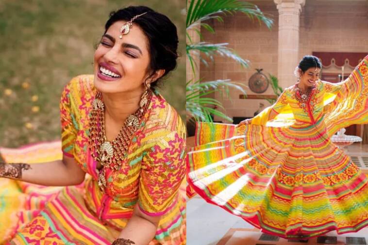 And of course, when we are talking about yellow ethnic outfits, how dare we forget Priyanka Chopra’s classic mehndi lehnga? This multicoloured lehenga with prominent shades of yellow, styled with heavy jewelry and a mang teeka, is absolutely to die for.