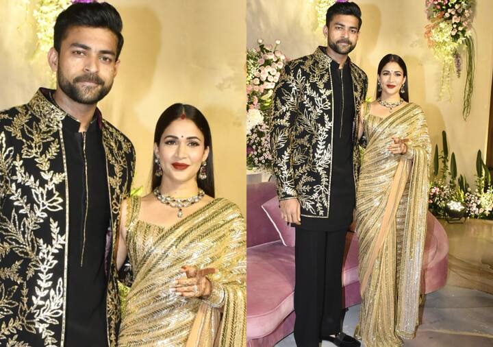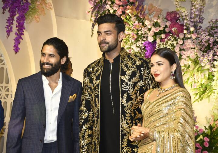 Lavanya Tripathi looked radiant in a golden sari at the wedding reception. On the other hand, Varun Tej wore a black kurta with an embroidered jacket. The marriage happened at a resort in Tuscany, Italy. This reception was for the industry. A number of actors graced the do...