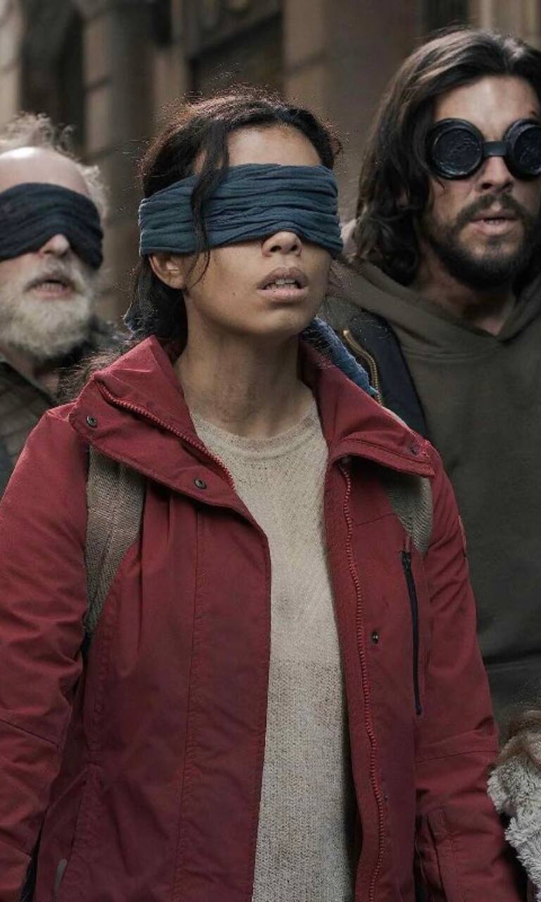 Bird Box (Netflix) depicts the story of Malorie Hayes, who tries to protect herself and two children from entities which cause people who look at them to kill themselves.